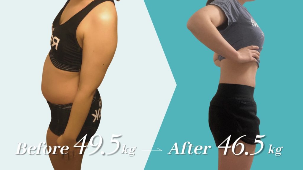 オンラインパーソナルトレーニング月4回、食事サポート付きのプランで、3カ月で3キロの減量に成功。見た目は数値以上に変化しているのが画像からわかります。