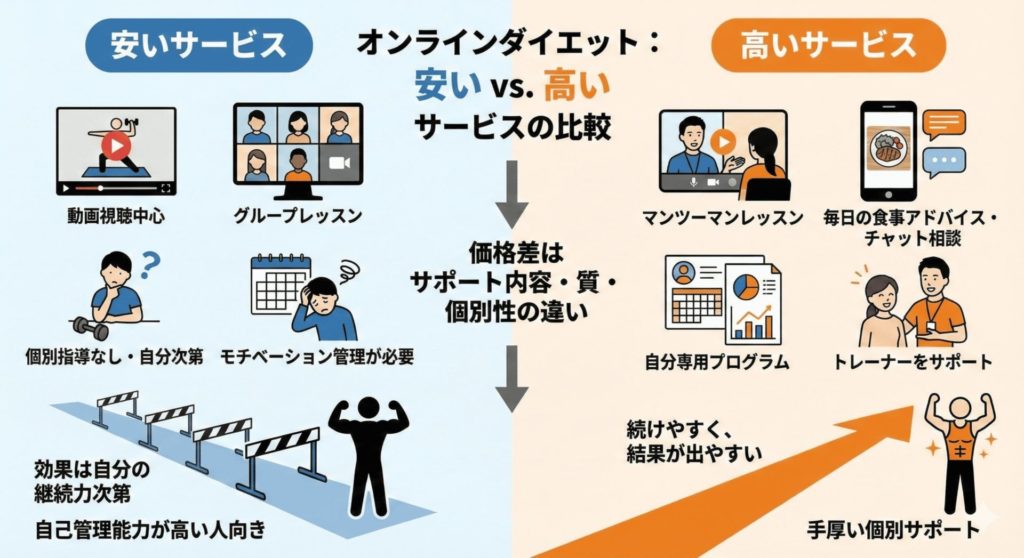 オンラインダイエットの価格差は、主にサポート内容・質・個別性の違いから生まれます。