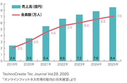 2019年には2.4億円だった市場規模は、2025年には8.4億円まで拡大すると言われています。コロナの流行をきっかけに生活スタイルが変化して、家でも手軽に取り組めるオンラインフィットネスがしだいに定着してきました。