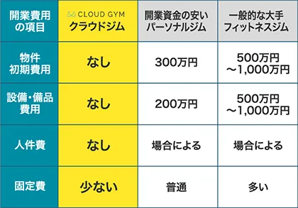 一般的にパーソナルジムを開業するには300万円ほど、フィットネスジムを開業するには500万円~1,000万円ほど初期費用が必要になります。しかし、CLOUD GYMなら初期費用がほとんどかからず、自宅で取り組めるため固定費もかかりません。このためリスクがほぼゼロで始められるビジネスモデルとして注目されています!